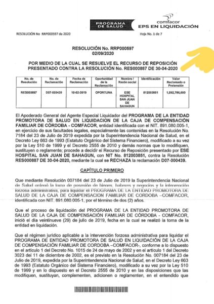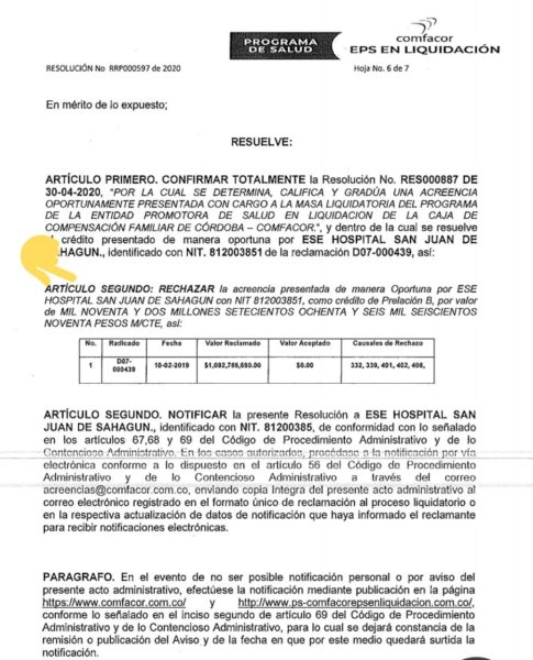 De esta forma, el hospital de Sahagún presentó proceso liquidatario del programa de entidad promotora de salud de Comfacor, mediante el cual solicitaron el reconocimiento de obligaciones, sin embargo, el recurso interpuesto se realizó de manera extratemporal, es decir fuera de los tiempos estipulados por la ley, por lo que la acreencia presentada por la ESE fue rechazada.