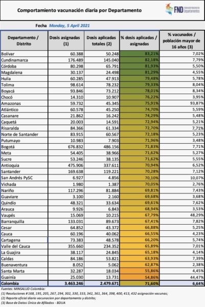 De acuerdo con el reporte de la FND, a corte del 5 de abril del 2021 al territorio cordobés le han asignado un total de 80.298 dosis de la vacuna contra la pandemia del coronavirus, de las cuales 65.791 ya han sido aplicadas, lo que representa un avance exacto del 81.93%.