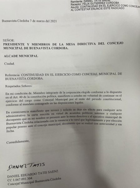 Llama la atención que entre los firmantes del Pacto de Buenavista se encuentre el candidato perdedor de la Alcaldía en las elecciones pasadas, Juan Vertel López, quien opto por ocupar una curul en el concejo municipal tal como lo ordena el estatuto de oposición, incluso se presume que es él quien encabezaría toda esta artimaña.