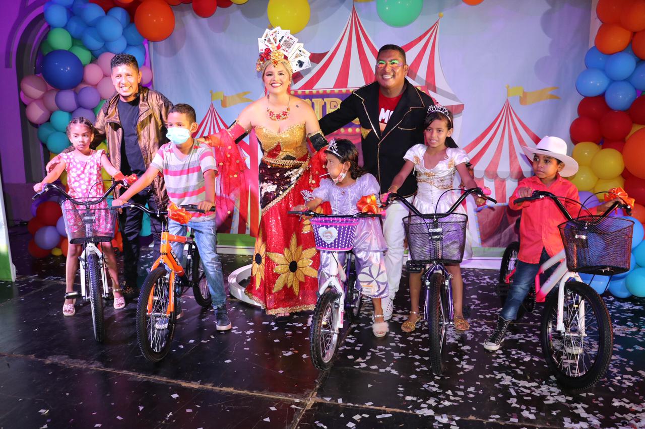 El alcalde Harving Espitia Arteaga y la gestora social Claudia García Martínez premiaron con 10 bicicletas a los niños que participaron en las dinámicas lúdico recreativas desarrolladas en medio del divertido encuentro.