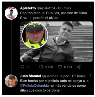 Es de resaltar que, el trino que realizó Juan Manuel fue borrado luego que muchos usuarios en la red social de Twitter lo empezaran a denunciar, sin embargo, en su cuenta se puede evidenciar amenazas contra muchos dirigentes de la oposición, además de una publicación donde celebró el asesinato de Dylan Cruz, un joven que murió el pasado 25 de noviembre de 2019 a manos del ESMAD, durante las manifestaciones realizadas en Bogotá, donde los jóvenes exigían garantías al gobierno para el acceso a la educación superior.