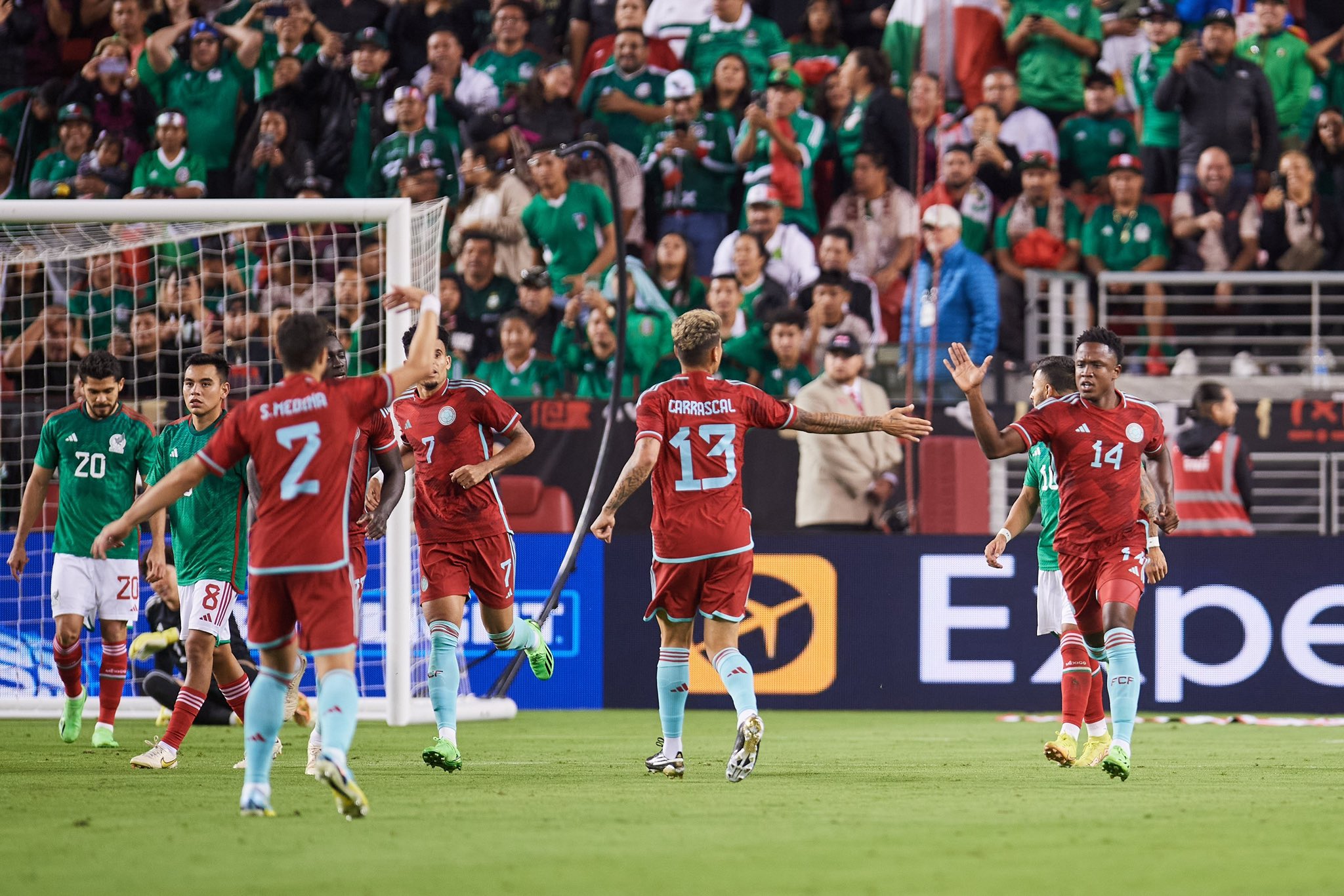 La tricolor, que apostó por arrancar con jugadores experimentados como James Rodríguez y Falcao García, tuvo un primer tiempo para el olvido, superada ampliamente por su rival que logró ponerla sobre las cuerdas con un marcador de 2-0, Alexis Vega (6’) de pena máxima y Gerardo Arteaga (29’) fueron los autores de las anotaciones.