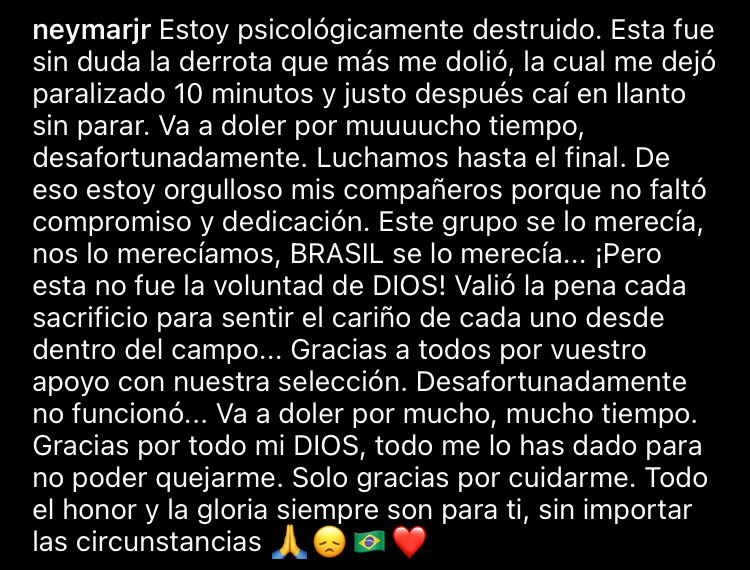 «Tengo orgullo de mis compañeros porque no hicieron falta compromiso ni dedicación. Este grupo lo merecía, nosotros lo merecíamos, Brasil lo merecía… Pero esa no era la voluntad de Dios», añadió.