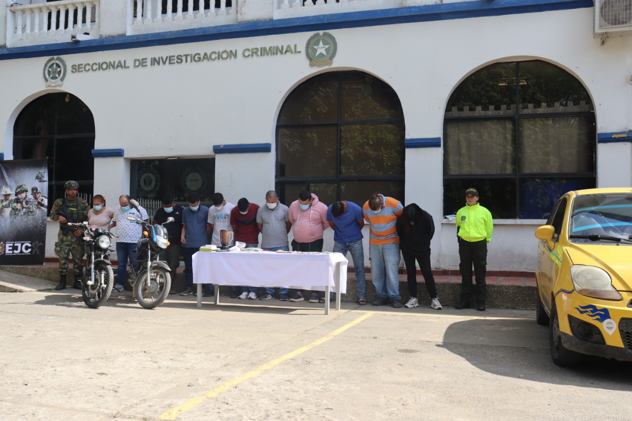 En el marco de la estrategia contra el tráfico local de estupefacientes, unidades de la seccional de investigación criminal de Montería con apoyo de la Seccional de Inteligencia Policial Montería y el Batallón de Infantería N°33 Batalla de ‘Junín’, logró la captura por orden judicial de 11 integrantes al servicio de la subestructura Javier Yepes Cantero del Grupo Armado Organizado, AGC, con injerencia criminal en la MEMOT e incautación de elementos, por el delito de concierto delinquir con fines de homicidio y fabricación, tráfico y porte de estupefacientes.