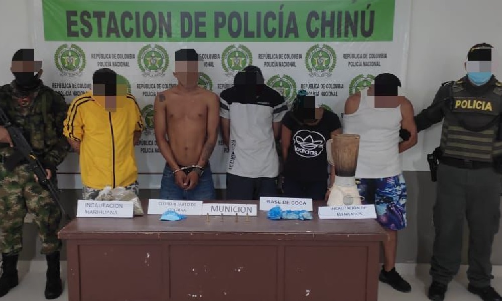 La ofensiva se llevó a cabo en el casco urbano del municipio de Chinú, Córdoba, donde fueron incautados más de 700 gramos de marihuana, 100 de pasta base de coca, 30 de clorhidrato de cocaína y cuatro cartuchos calibre 38, material que se encontraba en poder de estos sujetos.