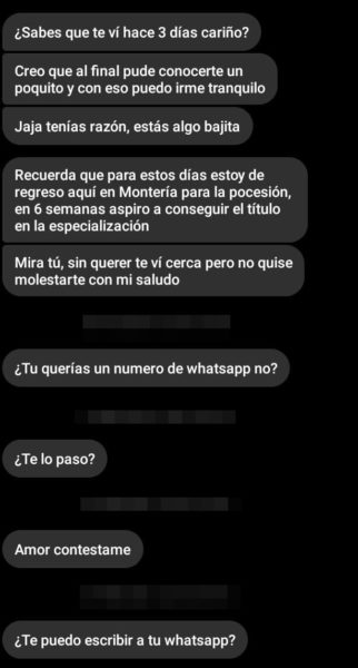 “Él me deja mensajes, pero yo nunca se los respondo, llegó a mandarme una imagen de Google Maps de donde está ubicada mi casa, sin yo cruzar una palabra con él y mucho menos conocerlo”, sostuvo la denunciante, que teme que este sujeto que respondería al nombre Gustavo Cogollo, pueda afectar su integridad, ya que es evidente que no está en su sano juicio.