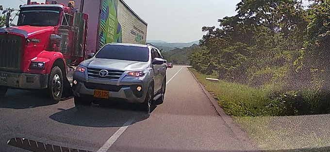 La imprudencia cometida por el infractor quedó registrada en video, en el que se observa como el conductor de una camioneta y de un tractocamión adelantaron en doble línea por la vía Troncal del Occidente a la altura del municipio de San Juan de Nepomuceno, Bolívar.