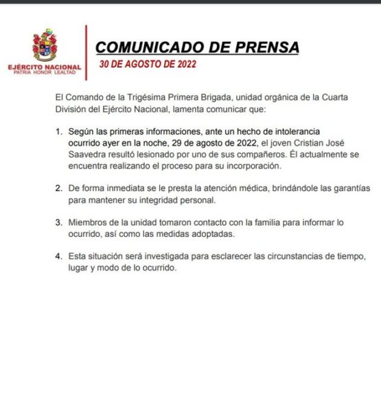 A raíz de lo sucedido, el Ejército emitió un comunicado en el que indicaron que, el hecho de intolerancia se presentó la noche del lunes 29 de agosto, luego que el joven que está en proceso de incorporación fuera agredido por uno de sus compañeros.