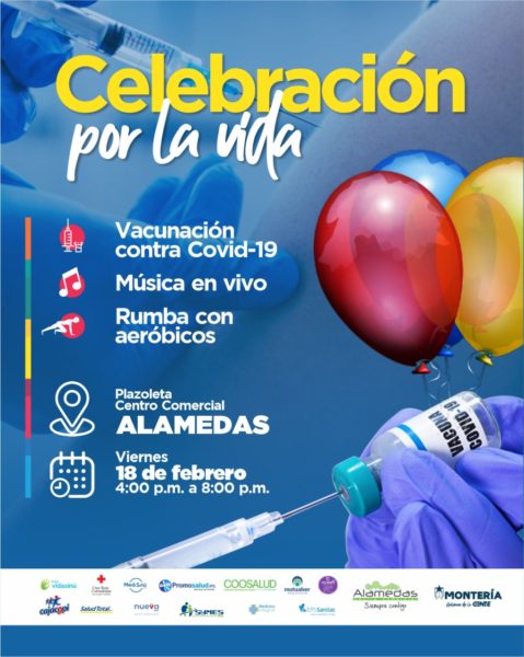 La alcaldía de Montería a través de la Secretaría de Salud y Seguridad Social en articulación con las IPS y EPS del municipio, realizarán este viernes 18 de febrero una gran jornada de vacunación en el Centro Comercial Alamedas para celebrar un año del inicio de la vacunación contra el Covid-19.