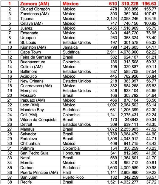 La mexicana Zamora en el estado de Michoacán, lidera la lista con 196,63 homicidios por cada 100.000 habitantes en el Ranking 2021 de las 50 ciudades más violentas del mundo.