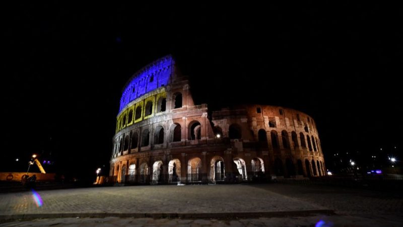 El Coliseo en Roma se iluminó con los colores de los Ucranianos. (Filippo Monteforte / AFP vía Getty)