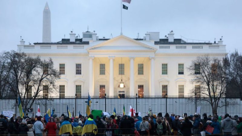 Manifestantes en el parque Lafayette cerca de la Casa Blanca, en Washington, protestas contra la operación de Rusia en Ucrania.