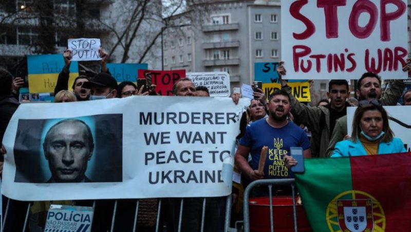Manifestantes con pancartas durante protesta contra la operación militar de Rusia en Ucrania, frente a la embajada rusa en Lisboa, Portugal. Carlos Costa/ AFP vía Getty Images