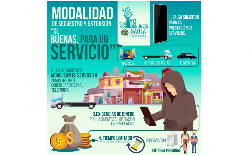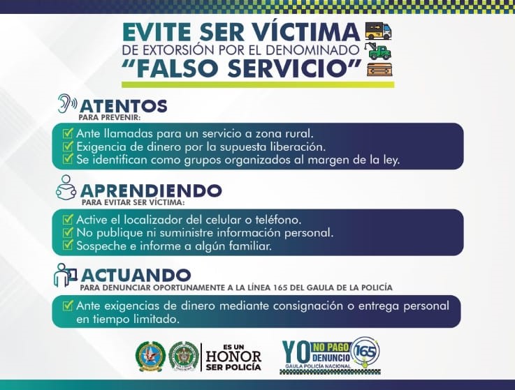 Ante la ocurrencia de los delitos de secuestro y extorsión, se recomienda a la ciudadanía que verifiquen quien es la persona que les solicita el servicio en especial sí es en zona rural, acérquese a la estación de Policía más cercana y manifiesten donde van a estar, soliciten un anticipo, hagan la verificación visual del lugar donde los están intimidando y salgan de allí, ante estos casos comuníquese oportunamente a través de la línea gratuita de atención 165.