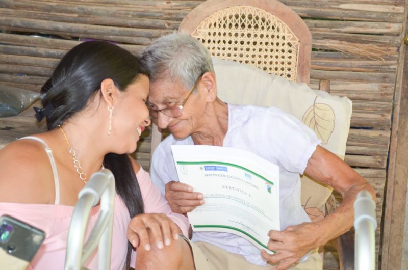 No pudo ir a la ceremonia grupal que se desarrolló en el colegio del pueblo, porque recientemente sufrió una caída en casa, pero el director del proyecto, profesor Mauricio Burgos Altamiranda, le llevó a su fresca vivienda de bahareque el pergamino que Claudina colgará en su habitación cerca de la cama. Eso dijo una vez fue sorprendida con la visita de la institución que ha enseñado a leer y a escribir a cerca de 1.400 adultos, desde que se ejecuta esta iniciativa hace poco más de un año.