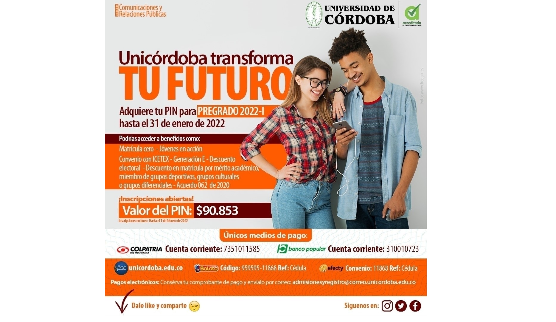 Hasta este 31 de enero está habilitada la venta de pines para aspirar a estudiar una carrera profesional en la Universidad de Córdoba, cuyo proceso de inscripciones se cerrará el primero de febrero y el 11 de ese mismo mes se publicará la lista de admitidos.