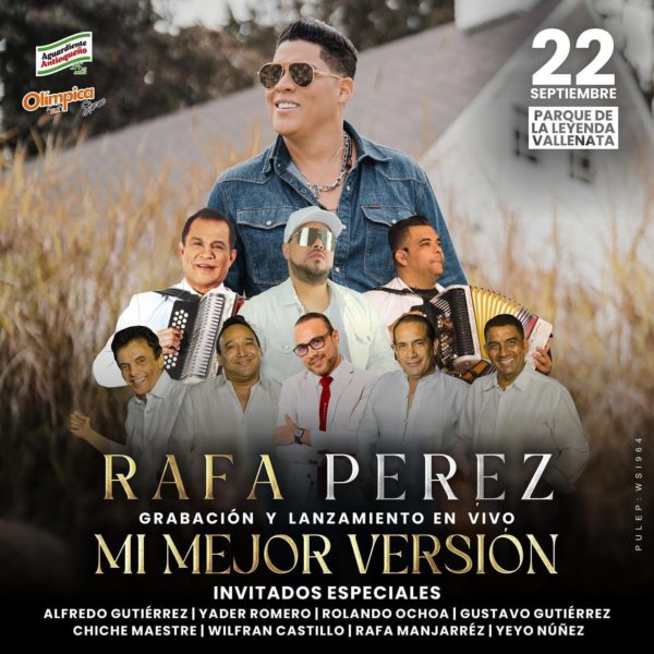 El cantante Rafa Pérez hará historia con el lanzamiento en vivo de su nuevo álbum musical ‘Mi Mejor Versión’, este viernes 22 de septiembre en el parque de la Leyenda en Valledupar, celebrando además su cumpleaños en el máximo templo del folclor vallenato.