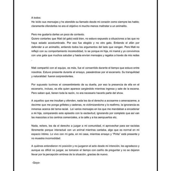 A pesar de que contó con el consentimiento de la dueña del animal, reconoció Goyo que sus críticos “tienen toda la razón, no era necesario hacerlo parte del show”. Sin embargo, arremetió contra los detractores que aprovecharon el suceso para lanzarle comentarios racistas: “leí varios mensajes en las que me mandaban a encadenar a mi hija, comparando este episodio con la esclavitud, ignorando por completo que así van las mascotas a los centros comerciales, a la calle y a los aeropuertos etc.”