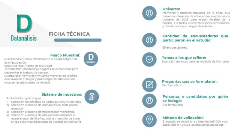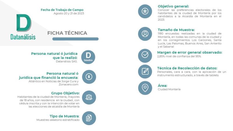Esta encuesta se basó en una muestra significativa de 1.180 entrevistas realizadas en la ciudad de Montería, abarcando todas las comunas y los corregimientos de Los Garzones, Santa Lucía, Las Palomas, Buenos Aires, San Anterito y El Sabanal.