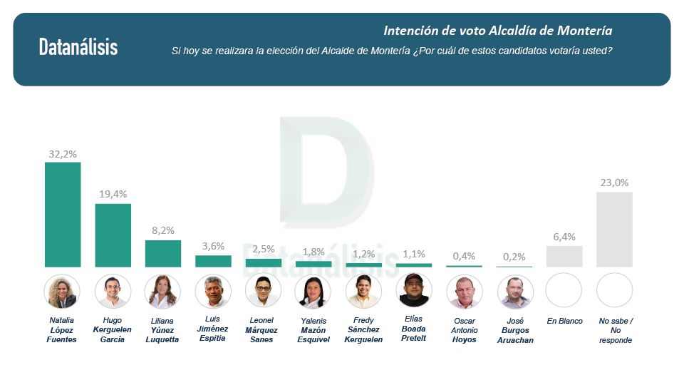 Natalia ha obtiene un sólido respaldo del 32,2%, consolidando su liderazgo en la contienda electoral. En segundo lugar, se encuentra el candidato Hugo Kerguelen García, con un 19,4% de apoyo, mientras que los demás candidatos registran menos del 10% de respaldo.