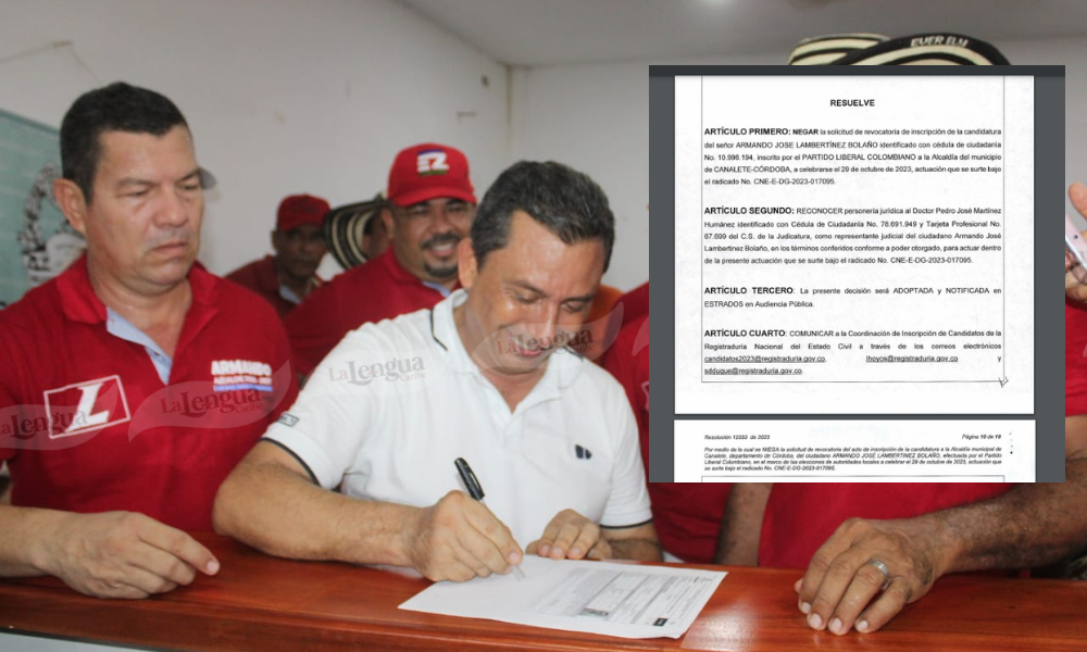 En las últimas horas el Consejo Nacional Electoral negó la solicitud de revocatoria del acto de inscripción de la candidatura de la alcaldía del municipio de canalete de Armando José Lambertinez Bolaño, efectuada por el partido Liberal colombiano, en el marco de las elecciones territoriales las cuales se llevarán a cabo el próximo 29 de octubre del presente año.