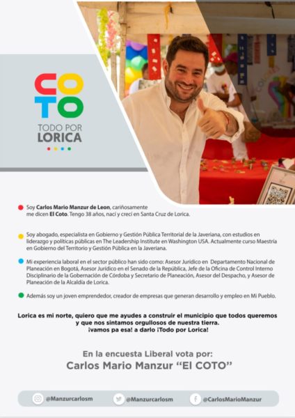 Así las cosas, Carlos Mario Manzur “El Coto” se abre camino para convertirse en el próximo alcalde del municipio de Lorica, y poner al servicio de la comunidad su liderazgo y capacidad para desarrollar estrategias de cambio.