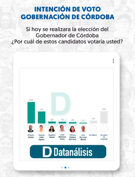 Un estudio de opinión adelantado por la firma encuestadora Datanálisis SAS y cuya ficha técnica fue revelada el día de ayer, arroja que el candidato a la Gobernación de Córdoba Erasmo Zuleta, lidera la intención de voto en el departamento.