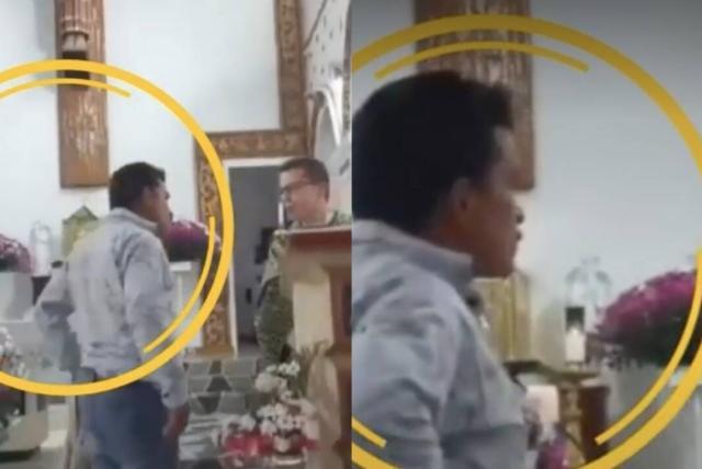 Pese a la actitud del sacerdote el hombre sigue ofuscado y con un poncho que tiene en sus manos sigue rodeando al sacerdote y diciendo groserías, por lo que otros asistentes a la iglesia deciden intervenir para evitar que el párroco fuera agredido.