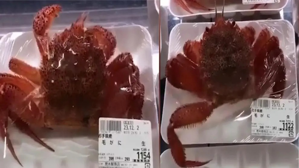 En el clip se observan a dos cangrejos envueltos en plástico dentro de una bandeja en lo que parece ser la sección de mariscos de un mercado japonés, intentando zafarse de allí.