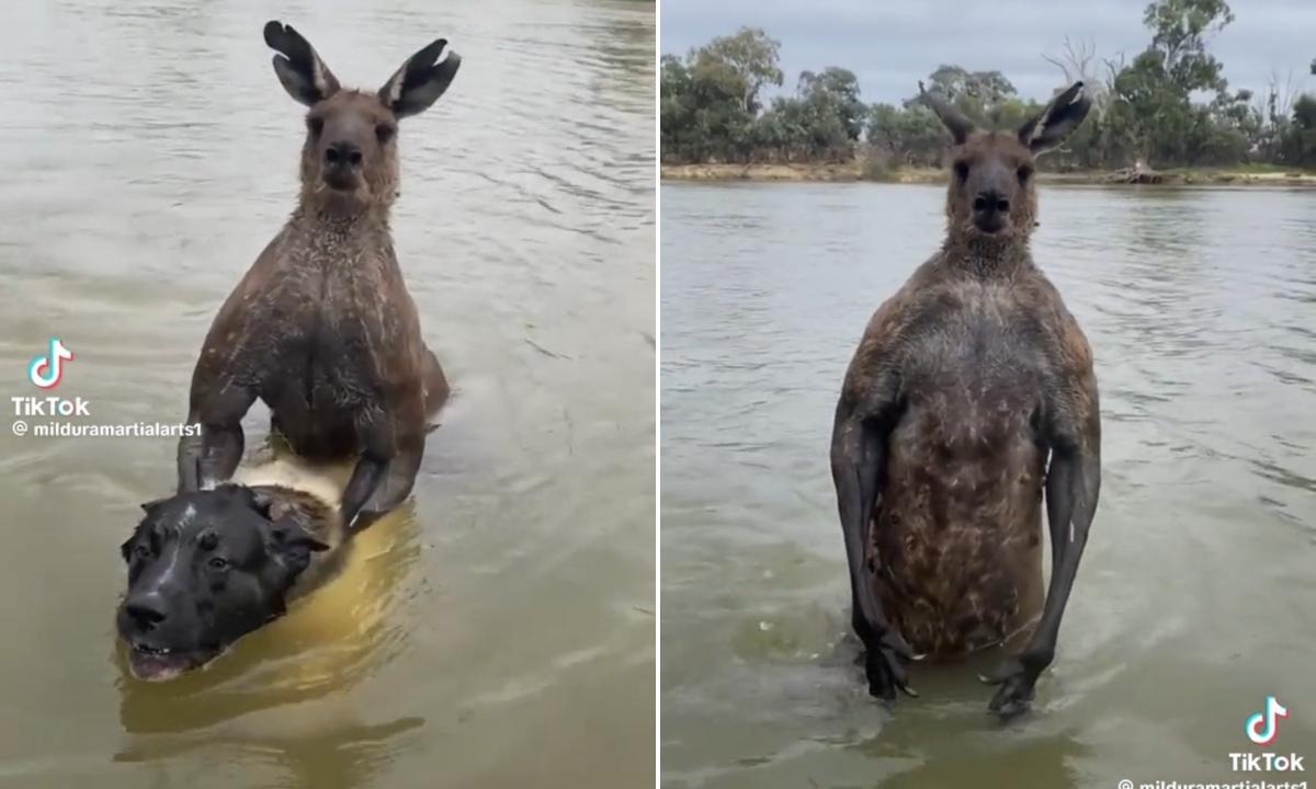 Todo empezó al parecer porque el canguro sostenía a la mascota del hombre por el cuello y se encontraba sumergiéndolo en el agua.