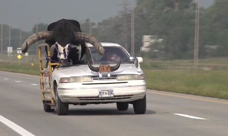 Al hombre se le ocurrió la idea de partir su carro a la mitad, un Ford Crown Victoria, para poder subir a su toro Watusi, una raza bovina oriunda de África, famosa por su enorme cornamenta.