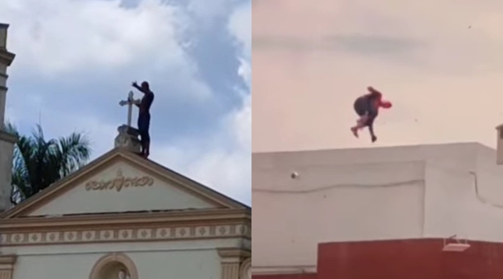 Aunque el riesgo al que se sometió tenía a todos “con el cristo en la boca”, lo que más llamó la atención de las personas, además de las maniobras y los saltos que realizaba el sujeto en lo alto de la iglesia y en algunos muros de edificios, es que estaba disfrazado de El Hombre Araña.