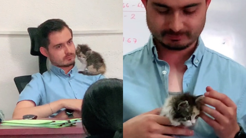 Los protagonistas de esta curiosa historia son un profesor y un inocente gatito bebé, quienes fueron captados por el lente de una de las estudiantes cuando se encontraban en el salón de clases.