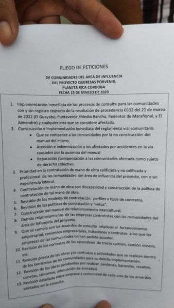 Dentro de su pliego de peticiones se observa la implementación inmediata de los procesos de consulta para las comunidades con y sin registro; la construcción implementación inmediata en reglamento vial comunitario; que se le dé prioridad en la contratación de mano de obra calificada y no calificada a las comunidades del área de influencia del proyecto, entre otras peticiones relacionadas con el funcionamiento, la contratación y las actividades que realiza cerro Matoso en las comunidades.