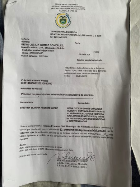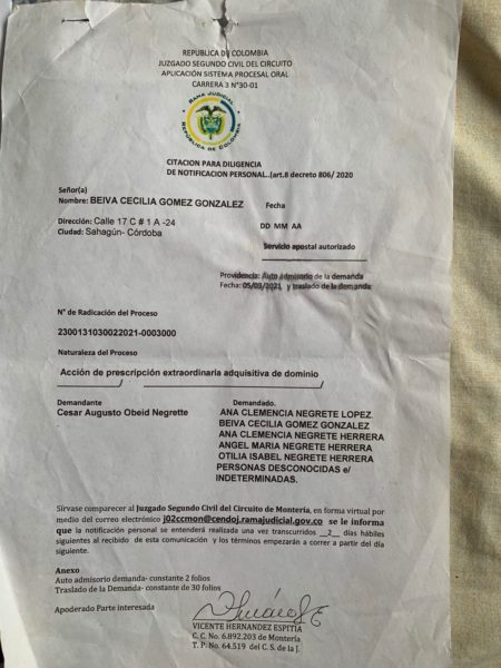 La defensa de la afectada indica que el señor Anselmo Gómez, murió el 22 de octubre del 2020 y dejó dos predios rurales en El Sabanal, en Montería, su única hija es Beiva González, por lo tanto, le corresponderían a ella.