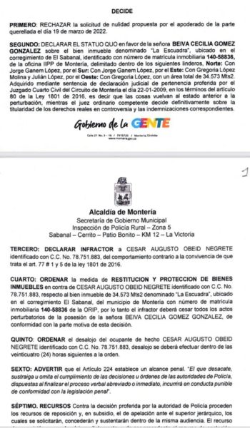 En ese mismo fallo, se ordenó la restitución y protección de bienes inmuebles, así como también se ordenó del desalojo de Cesar Obeid, sin embargo, este ultimo presentó una apelación, recurso que se encuentra en estos momentos en la Alcaldía de Montería.