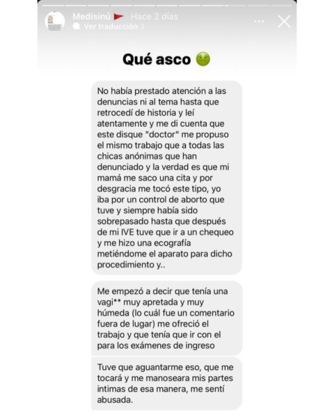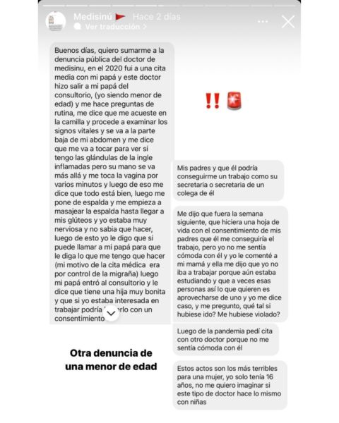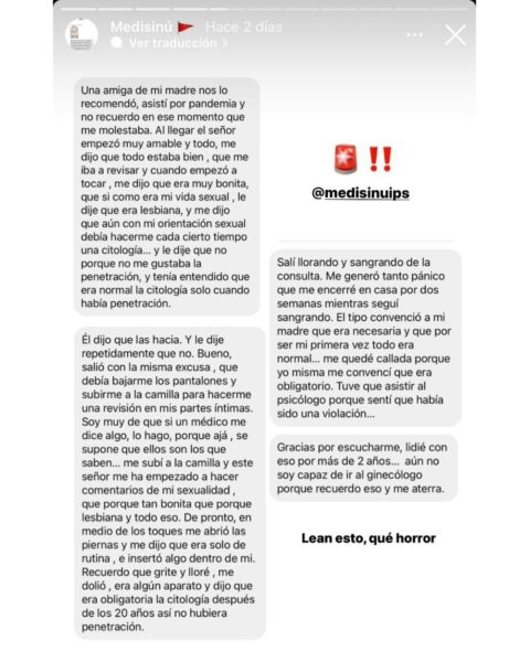 “Fui a consulta general y él determinó que era una infección urinaria, me asignó una nueva cita y me recetó unas cremas para llevar ese día. Cuando estaba en su consultorio me pidió retirar la ropa de abajo y que me acostara en una camilla”, dijo una de las denunciantes anónimas.