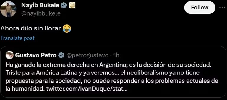 Una de las respuestas más controvertidas fue la de Nayib Bukele, presidente de El Salvador, quien ha protagonizado múltiples enfrentamientos con el mandatario colombiano.