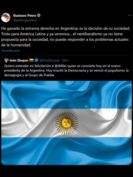 “Ha ganado la extrema derecha en Argentina; es la decisión de su sociedad. Triste para América Latina y ya veremos… el neoliberalismo ya no tiene propuesta para la sociedad, no puede responder a los problemas actuales de la humanidad”, indicó Petro.