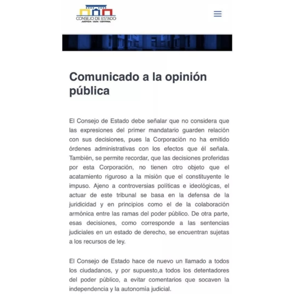 A raíz de que el presidente de la república Gustavo Petro lanzara críticas por los fallos judiciales al Consejo de Estado, este último hace un fuerte llamado al mandatario a través de un comunicado, pidiéndole que respete la independencia de poderes.
