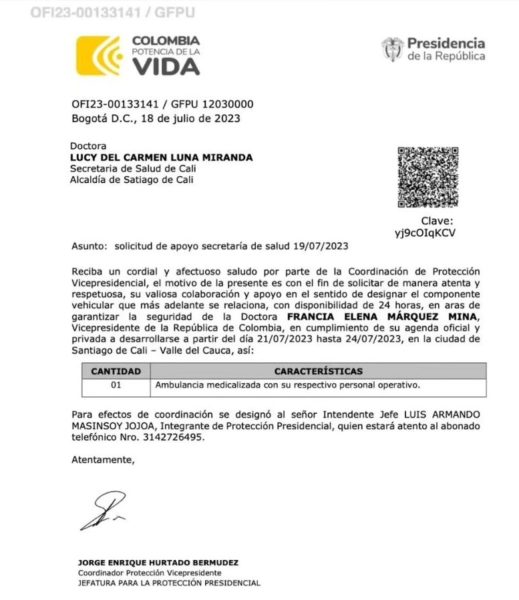 En ese documento, Hurtado le pide a Lucy de manera atenta y respetuosa, su valiosa colaboración y apoyo”, con el fin de otorgarle a Francia Márquez una ambulancia con “disponibilidad de 24 horas”, en el marco de su agenda oficial y privada entre los días 21 y 24 de julio.