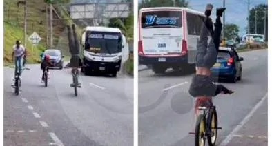 Pues ahora se registra una nueva forma en como los jóvenes arriesgan sus vidas. Como un joven que se encontraba exponiéndose junto a varios compañeros, al bajar por una transcurrida vía con la cabeza en su bicicleta, es decir, el chico se encontraba en posición invertida.