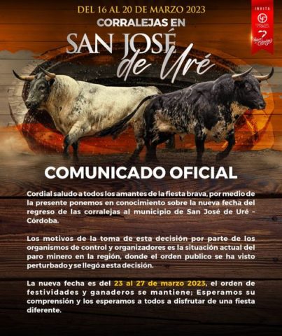 En las últimas horas la junta directiva de las corralejas del municipio de San José de Uré, informaron que estas tradicionales fiestas fueron reprogramadas debido a la situación de orden público que se está viviendo en el San Jorge y Bajo Cauca.