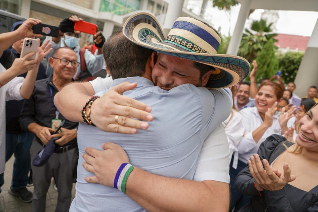 «Con mucho entusiasmo recibimos en su primera visita al Palacio de Naín, al Gobernador electo, Erasmo Zuleta Bechara y su esposa Valeria Vega», agregó el jefe del gobierno departamental, mientras le daba un fuerte abrazo a quien será su sucesor a partir del 1 de enero de 2024.