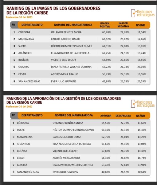 El mandatario de los cordobeses es además el mejor calificado de la región caribe colombiana, pues quien le sigue, Carlos Caicedo Omar, gobernador del Magdalena obtiene un 63,52% de aprobación, mientras que Héctor Olimpo espinosa Oliver logra un 62,91% de respaldo; Elsa Noguera de la Espriella, del Atlántico tiene un reconocimiento del 62,25%; Vicente Blel Escaff, del departamento de Bolívar 58,59% de aprobación; Diala Patricia Wilches Cortina, de la Guajiro consigue 55,27%; Andrés Mesa Araújo, del Cesar obtuvo 55,73% y Hever Julio Hawkins de San Andrés Islas alcanza un 43,88% de favorabilidad.