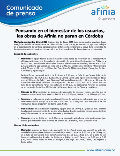 Montería: el equipo técnico sigue avanzando en los planes de renovación de la infraestructura eléctrica, actividades que demandan la interrupción del suministro eléctrico entre las 7:00 a.m. y las 5:00 p.m., en los barrios Villa Caribe, Bonanza y la Urbanización Mandala; de 6:40 a.m. a 5:00 p.m., en el barrio Los Colores; de 7:00 a.m. a 5:00 p.m., en los barrios Villa Sinú y Nueva Belén; y de 8:00 a.m. a 4:00 p.m., en El Faro, Las Tinas, Risueña, El Campano, Puerto Franco, Las Babillas, Caño Viejo y Aguas Negras.