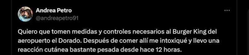 Andrea Petro, hija del presidente Gustavo Petro, ha solicitado a través de su cuenta de X que se tomen medidas y controles necesarios en el restaurante Burger King del Aeropuerto El Dorado.