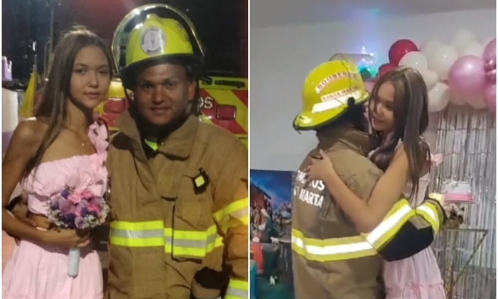 Miguel Barranco, un dedicado bombero de Santa Marta, emocionó a su hija y a los asistentes al llegar a su fiesta de quince años vestido con su uniforme y a bordo de un camión de bomberos.