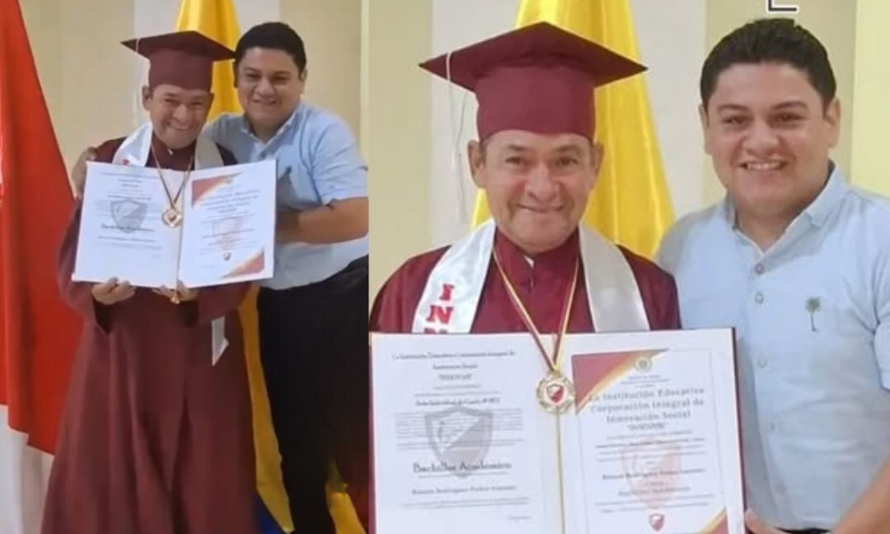 Lo que hizo este momento aún más especial fue que el propio hijo de don Pedro, Braihan Jhordin Rincón Cordon, ahora profesor, fue quien tuvo el honor de entregarle el diploma a su padre.