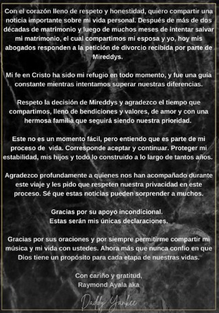 «Con el corazón lleno de respeto y honestidad, quiero compartir una noticia importante sobre mi vida personal. Después de más de dos décadas de matrimonio y luego de muchos meses de intentar salvar mi matrimonio, el cual compartimos mi esposa y yo, hoy mis abogados responden a la petición de divorcio recibida por parte de Mireddys,» escribió Daddy Yankee.